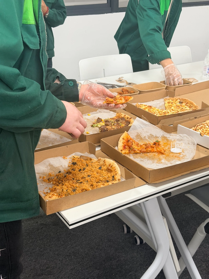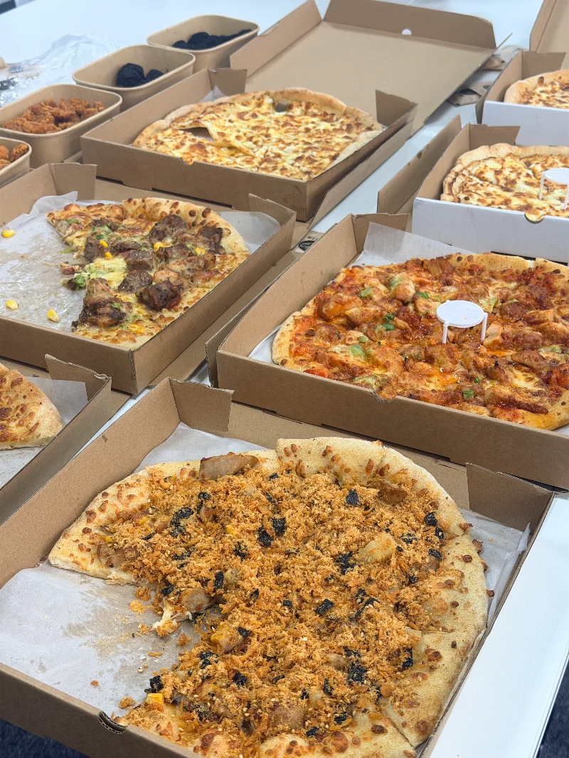 Cistae Neapolitanae mensas impleverunt, et munus statim aromatibus delitiis involutum est. Lassitudine nullo tempore evanuit. Collegae eorum monitores oculos super oculos accensis. Clamavit aliquis, "Pizza adest!" et sicut hoc, tota turma circumdedit.